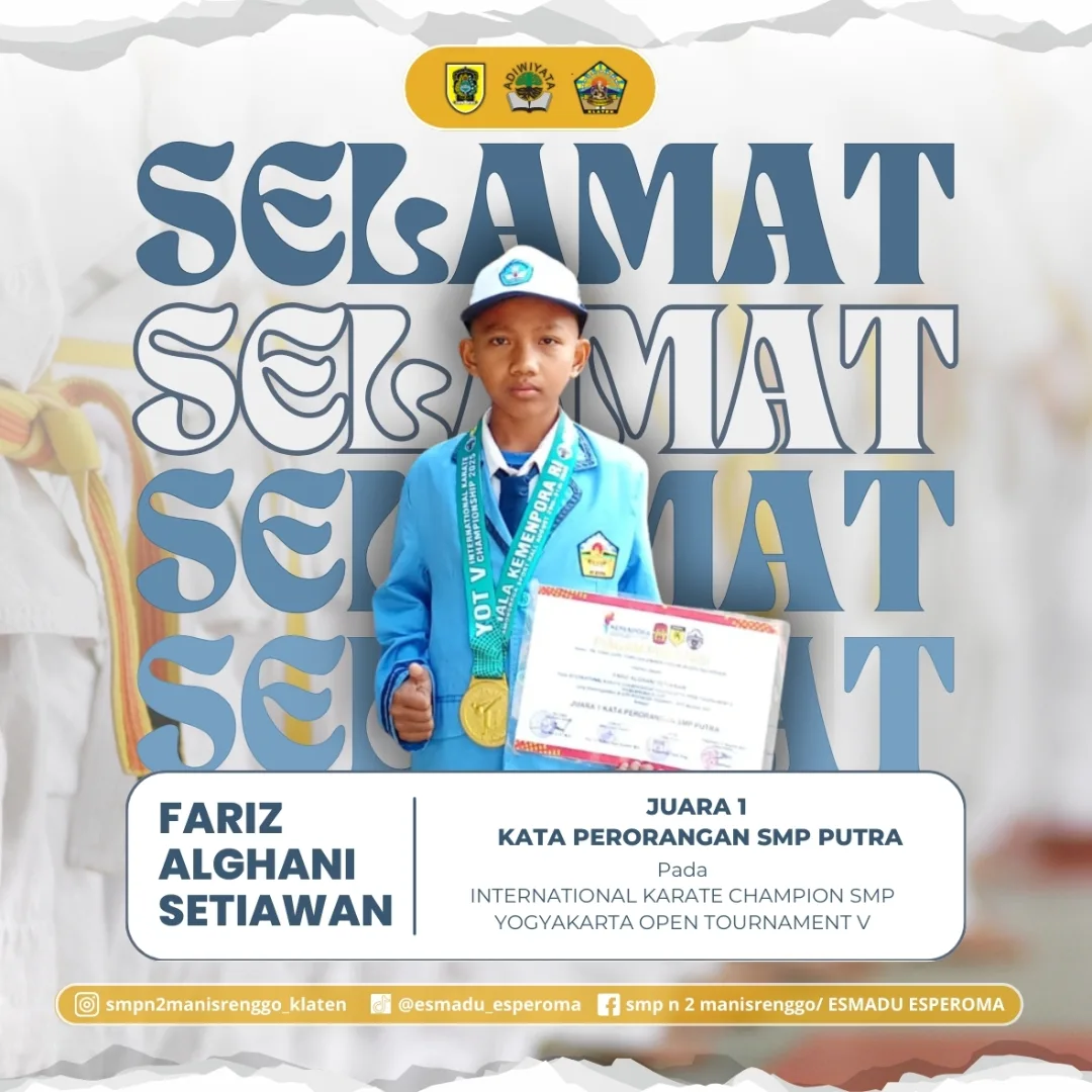 Prestasi membanggakan kembali diraih oleh peserta didik SMP N 2 Manisrenggo. Fariz Alghani Setiawan dari Kelas VIII D berhasil meraih Juara 1 Kata Perorangan SMP Putra pada ajang International Karate Champion Yogyakarta Open Turnamen V.